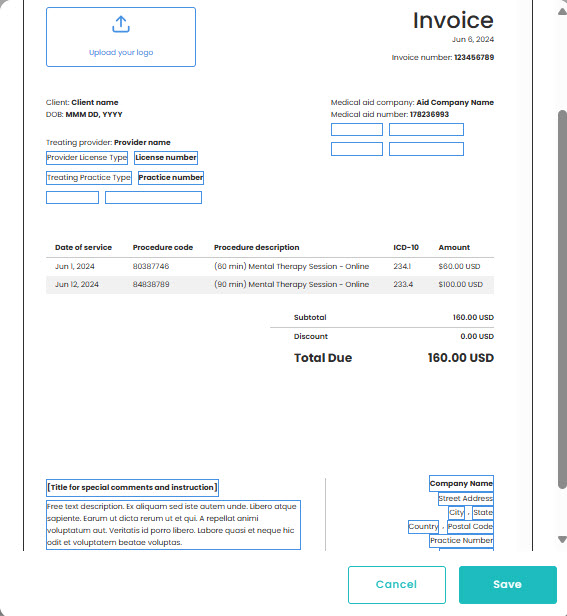 All information in black type on the invoice template is automatically pulled from the system and added to the client’s invoice or receipt when created. This can include the following details based on the template choice:
